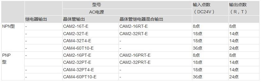 NPN型輸入,晶體管(T)/晶體管繼電器混合(RT)輸出,AC220V(E)