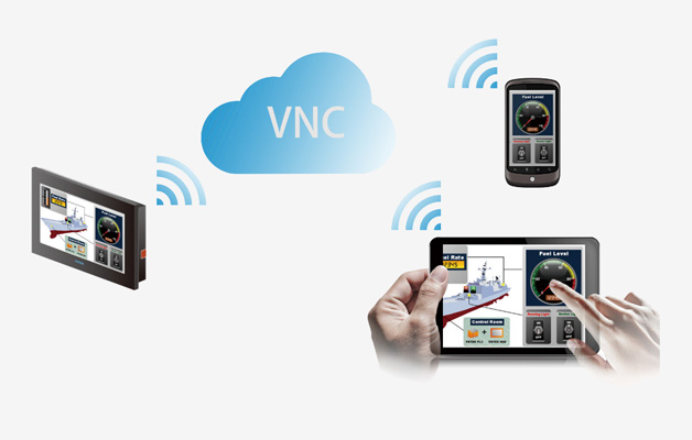 2.VNC功能。一般的設備操作,操作員只需在HMI操作界面操作就可以了。如果說HMI置放的位置不方便經?;蛘唛L時間操作,或者操作員想隨時隨地查看和操作HMI界面,這時永宏C3/P5系列觸摸屏就能很好的幫您解決這個問題。針對操作員不在HMI操作界面現場的情況,操作員可以在電腦上使用VNC客戶端,或者手機上下載VNC軟件,通過網絡,可直接將HMI的畫面顯示在電腦或者手機上,同時也能在電腦或手機上操作,支持此功能的HMI需配帶以太網接口。
